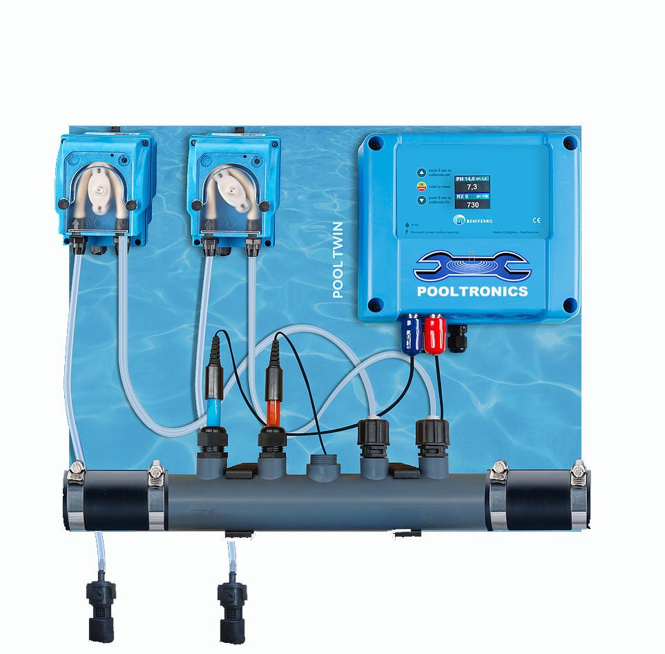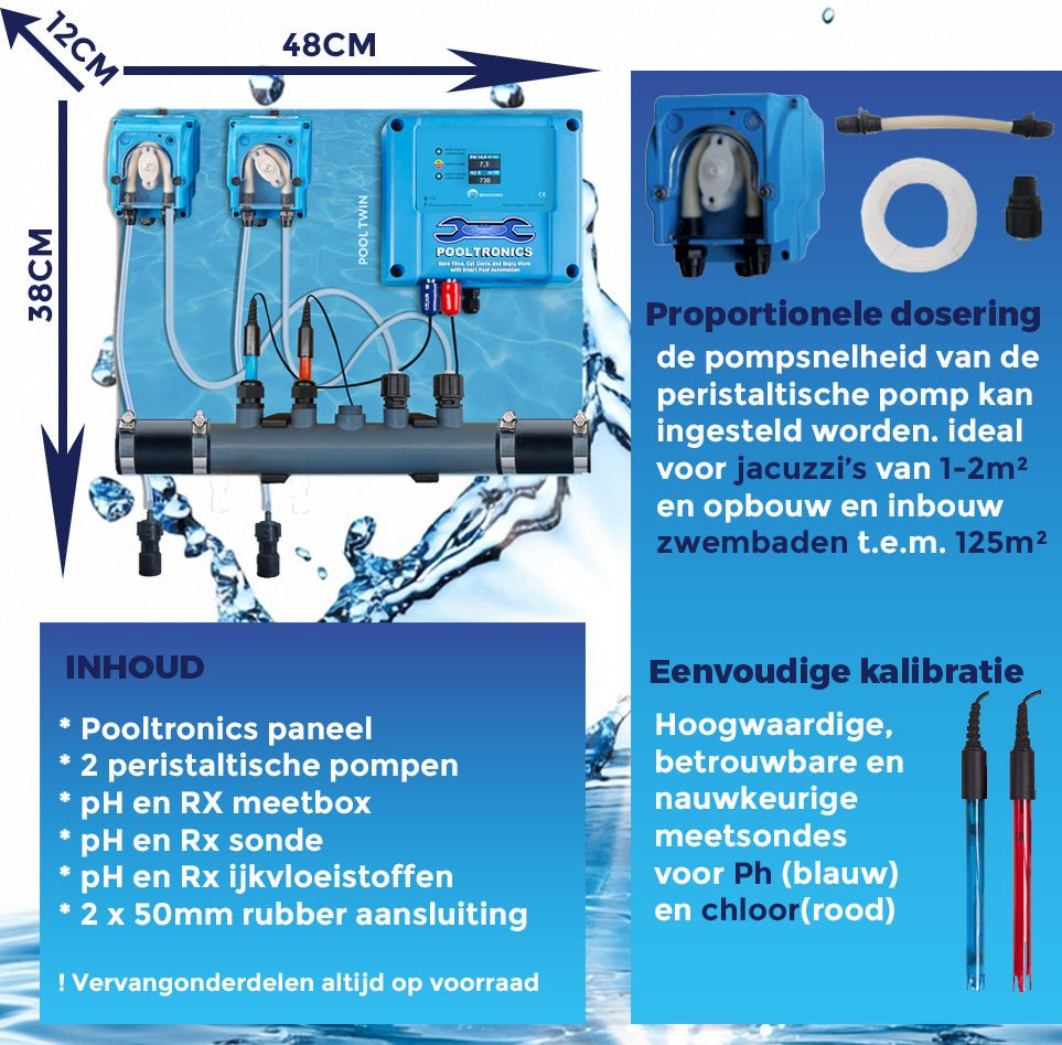 de pH en ORP (chloor) en past de waarden van het zwembad automatisch aan. Bij