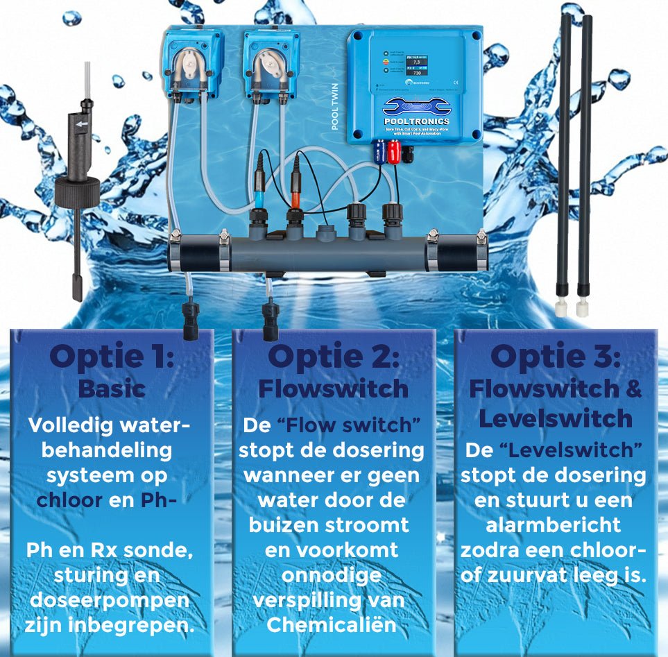 Houd uw zwembad kristalhelder en gezond met ons automatische pH- en chloordoseersysteem! Ons systeem is ontworpen met uw gemak en het milieu in gedachten. Door de chemicaliën in uw zwembad automatisch te reguleren, kunt u geld besparen op zwembadchemicaliën en uw ecologische voetafdruk verkleinen.